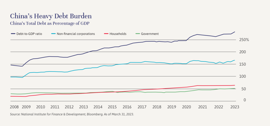 The central government has stepped in for now, with a plan announced in August 2023 that allows local governments to raise about $140 billion in bond sales to refinance the struggling LGFVs. While this amount will in no way cover all the failing LGFVs, the now more explicit backing of the central government may provide some comfort to investors and banks with exposure to these vehicles. It also makes it clearer that the large debt load represented by the LGFVs can be considered a direct liability of the government.