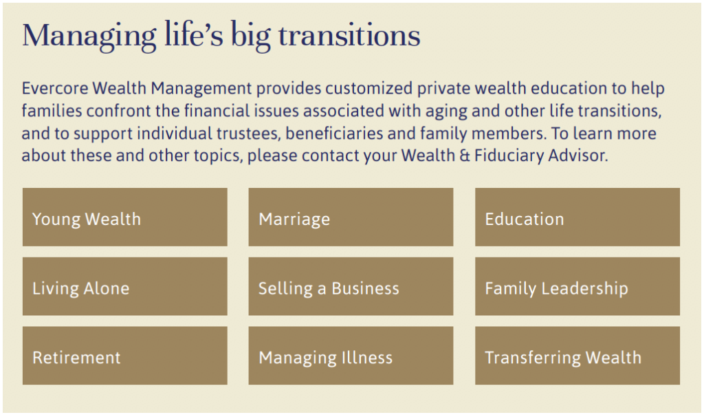 Multigenerational family wealth is often complex, bringing responsibilities as well as advantages to its members. At Evercore Wealth Management and Evercore Trust Company, we work with families to help preserve harmony while securing lasting legacies.