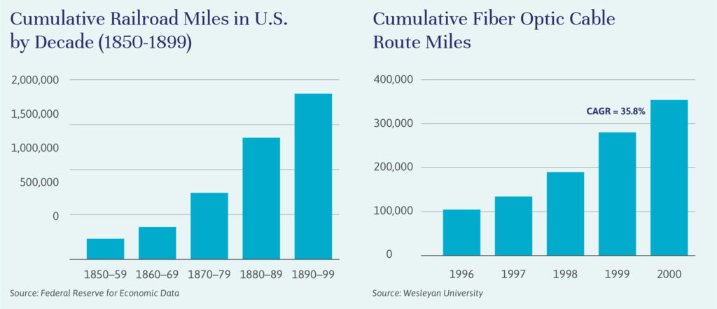 This set off a wave of investment. Technology-focused capital spending between 1996 and 2000 increased by 75.6% cumulatively.1 Many of these big spenders were new entrants into telecommunications infrastructure, spurred by deregulation and further encouraged by a massive growth opportunity. While the internet usage and use cases continued to grow for decades, by 2001 it was clear too much capital had been deployed too quickly. Problems were exacerbated by fraud and too much debt: Global Crossing, WorldCom and Enron all went bankrupt due either to fraud or too much debt, or in some cases, both. The subsequent stock market crash resulted in massive declines, over 70% for both the tech-heavy Nasdaq and the S&P 500 Communications Services Sector Index.2 As with the railways, many of the companies that invested in the fiber build-out of the 1990s were not around to see it come to fruition. While AT&T, Verizon and Cisco are all still around, Amazon and Google, which used the internet and telecommunications network to build massive global businesses, turned out to be better investments.