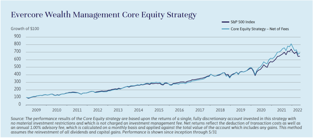 Evercore Wealth Management strives to purchase shares of high-quality businesses at attractive valuations and hold them for the long term. As illustrated below, this approach has enabled our clients to benefit from the economic advantages of these stable businesses and capture their long-term compounding effects.