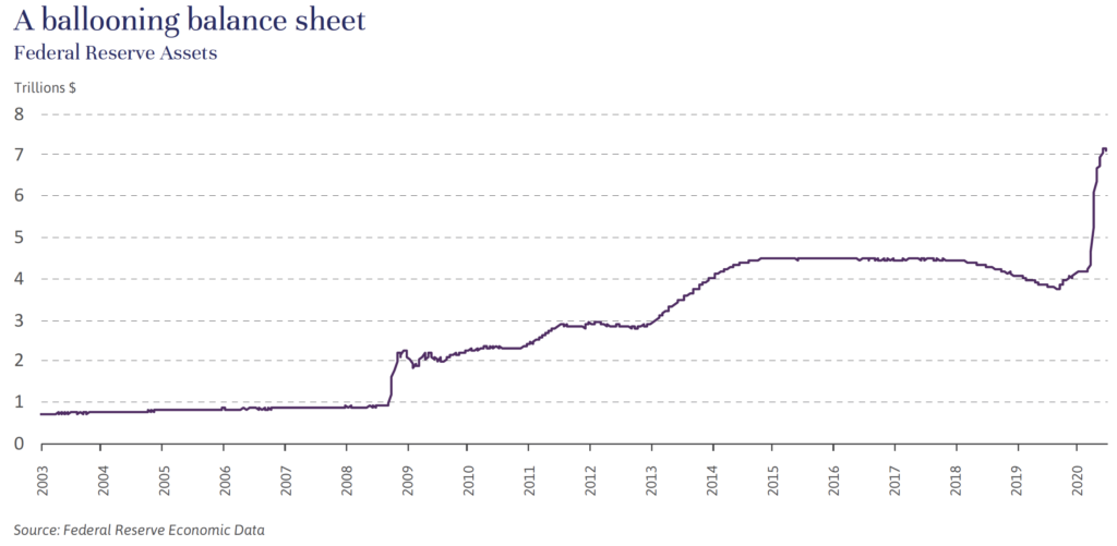 Perhaps it might be, if the Federal Reserve were to not just expand its balance sheet by purchasing securities temporarily – as it did with quantitative easing, or QE, post the financial crisis of 2008-2009 – but were to also extend credit to the private sector on a permanent basis, delivering this so-called helicopter money directly and permanently to the consumers and small businesses most likely to spend it. Importantly, this would involve the government and the Federal Reserve working in concert, with the Treasury issuing debts to finance the permanently elevated government deficit, and the Federal Reserve then purchasing the new debt with newly printed money.
