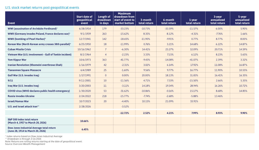 Still, it’s important to remember that while equity market drawdowns can be severe in times of geopolitical upheaval, the long-term impact is rarely negative. (See the chart below and our earlier article here https://evercorewealthandtrust.com/geopolitical-crises-and-markets/.)