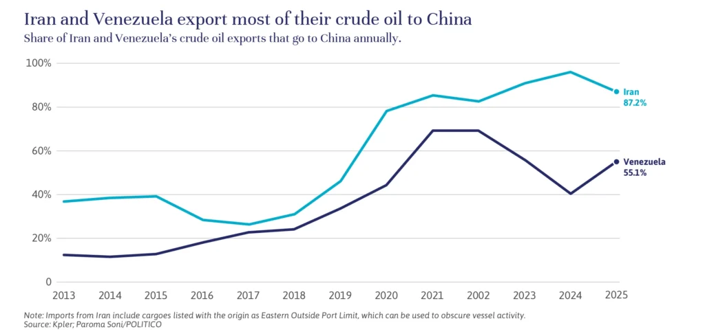The U.S. attack on Iran in February (the second in two years) and the removal of Venezuelan dictator Nicolás Maduro in January were both strategically significant for China. Nearly 17% of China’s oil imports came from Iran and Venezuela in 2025 (see the chart on page 4). And Russia, which has become increasingly economically dependent on China since its 2022 invasion of Ukraine and the subsequent sanctions by the United States, Europe and others, has significantly increased its exports of natural gas and oil to China.