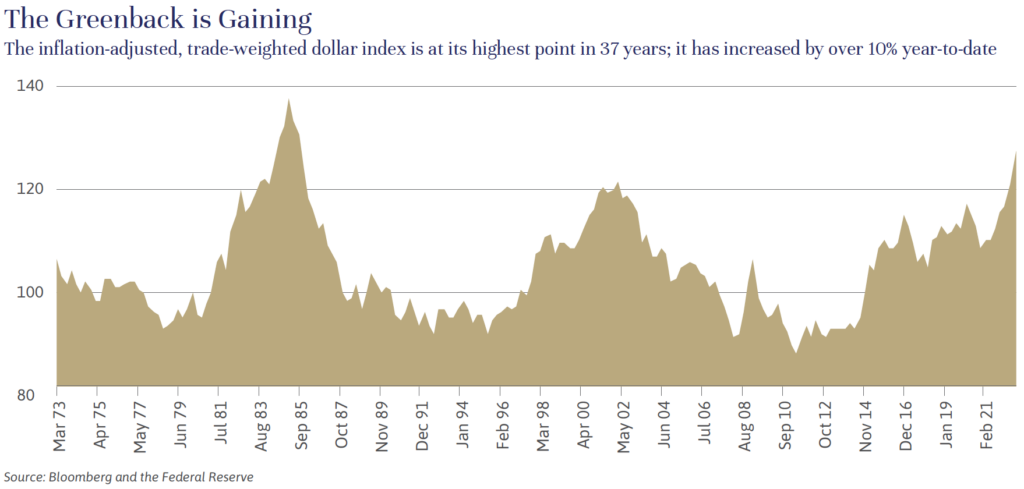 The U.S. dollar hasn’t been this strong since 1985, right before representatives from West Germany, France, the United Kingdom, Japan, and the United States met at the Plaza Hotel in New York City with the shared goal of driving the dollar down, to improve the global trade balance. That degree of collaboration this time around seems unlikely and, as yet, unwarranted, but investors everywhere might have reason to hope that the dollar loses at least a little steam.