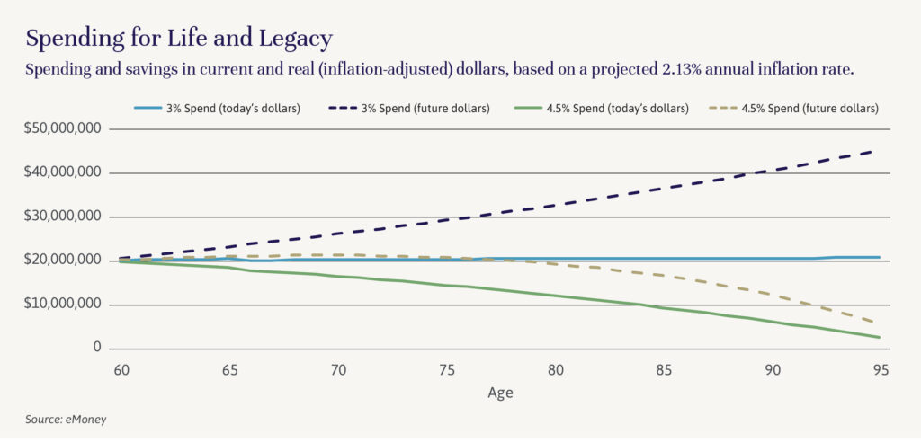 These are all wonderful ways to spend, of course. But they will be more enjoyable for those comfortable with the tradeoffs. And there are usually tradeoffs, no matter how large the portfolio. Take a look at the chart below. Here’s what seemingly small differences in spending rates can do to the same $20 million portfolio.