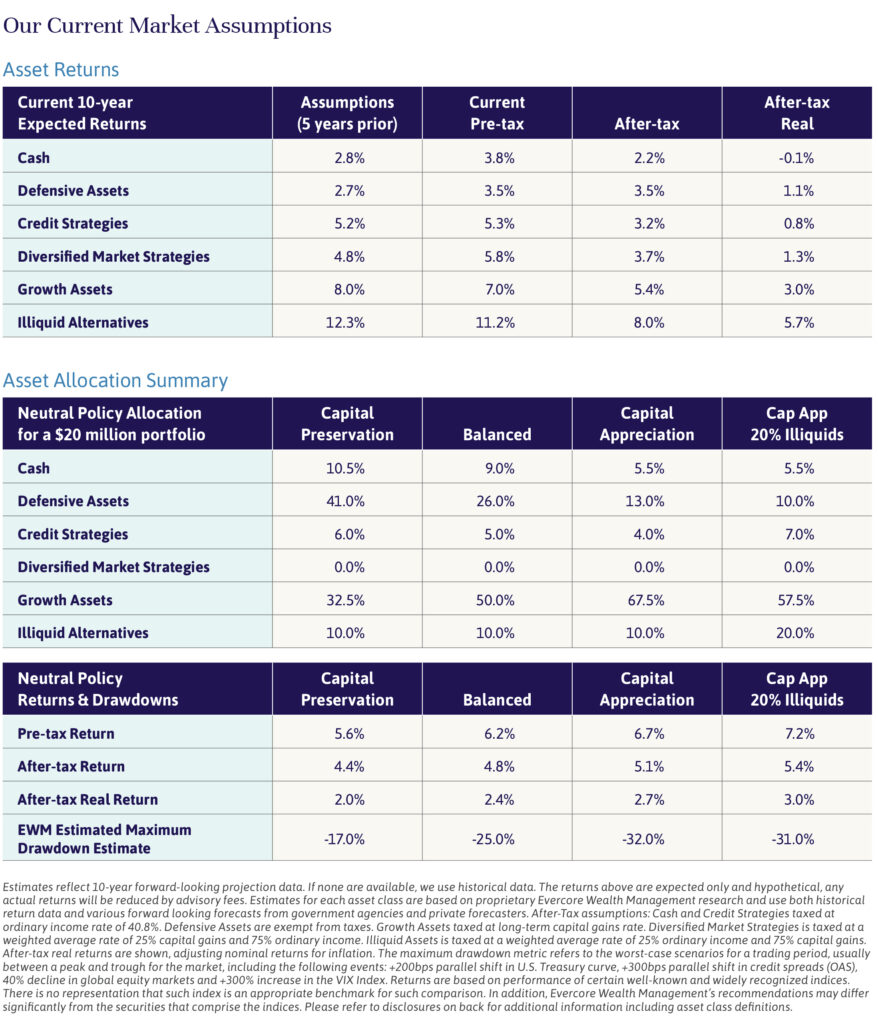So, how do we find financial balance in our so-called golden years? The starting point is a thorough lifestyle analysis, to evaluate current and future spending needs, mindful of the need to fund potentially very long lives. These calculations should take into consideration capital market return assumptions, as well as estimated inflation and tax rates, and individual tolerance for market and liquidity risk. (For our current capital market return assumptions, see chart below.)