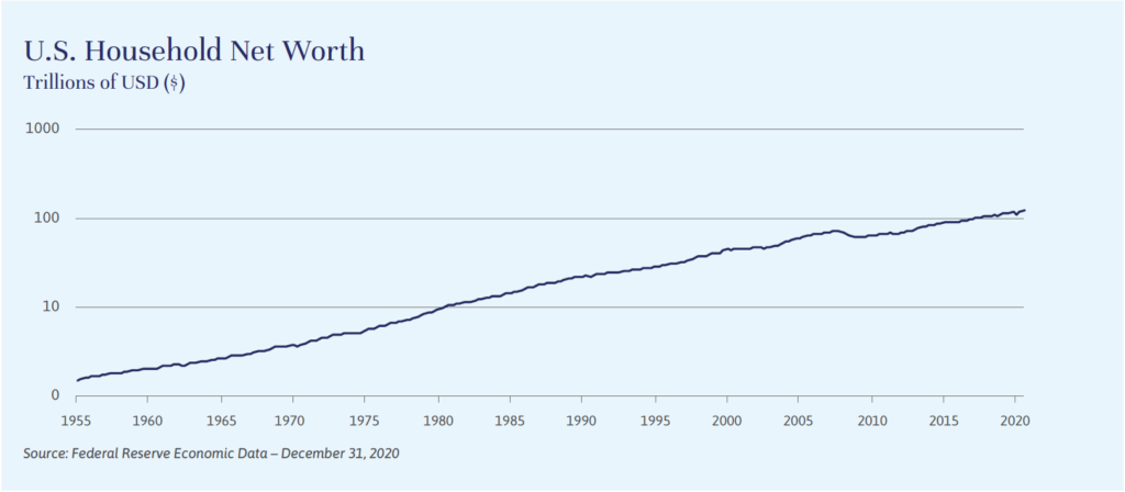 Household net worth, probably the best metric to understand broad-based asset inflation, hit a U.S. record in absolute terms in the third quarter of 2020 at $123.5 trillion, according to Federal Reserve data. Much of the value of U.S. household net worth derives from ownership of equities, bonds and real estate. On a relative basis to disposable income and to GDP, it is near the post-WWII high and at the post-WWII high, respectively.