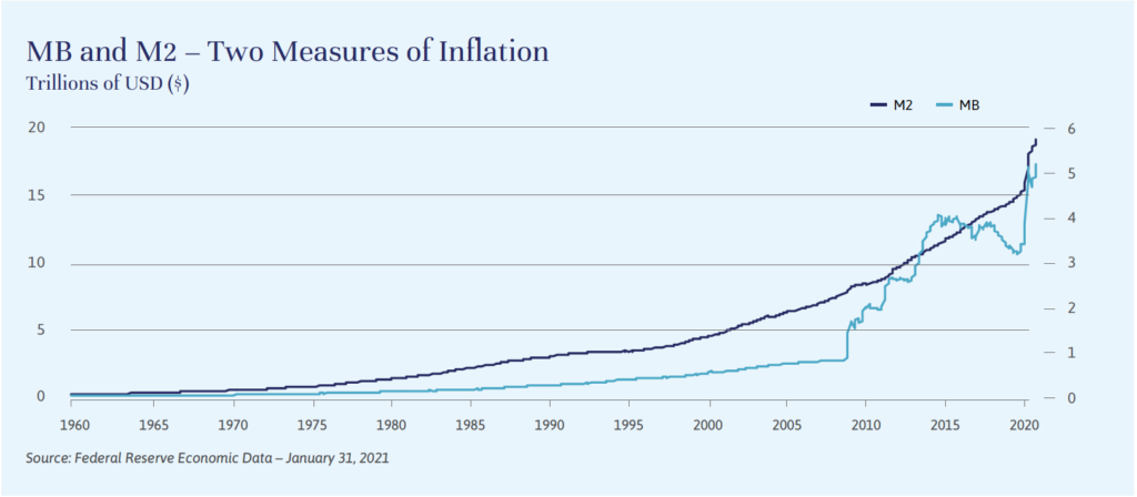 Monetary inflation generally refers to increases in the supply of money, and is most commonly measured by the monetary base or “MB”, which includes currency in circulation and money held in the reserve accounts of Federal Reserve member banks. MB represents the liability side of the central bank’s balance sheet, while government debt (e.g., U.S. Treasuries) or other securities purchased by the central bank represent the asset side. As with any balance sheet, assets must match liabilities, so increases in central bank bond purchases simultaneously increase the monetary base. MB is tightly tied to “M2″, a broader definition and a calculation that includes cash, checking and savings deposits, money market securities and funds, as well as other easily convertible “near money” deposits. M2 is closely watched as an indicator of money supply and inflation. A rise in MB drives M2 higher, as illustrated in the chart below. The significant increases in both Treasury purchases by the Fed and Treasury issuance in 2020 by the government have led to a corresponding spike in M2 not seen in over half a century.