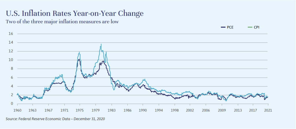 As discussed in the cover article of this issue, the potential for monetary and fiscal policy expansion to push consumer prices higher is far from a given. But it may be the single biggest risk to a traditional portfolio of stocks and bonds, as significantly higher consumer price inflation would likely take significant steam out of asset prices. While our base case remains a continued period of low inflation, we will continue to diligently monitor the factors that drive longer-term inflation and consider investments that could offer protection. As always, diversification of risk and appropriate asset allocation is our best defense against any long-term risk, inflation included.
