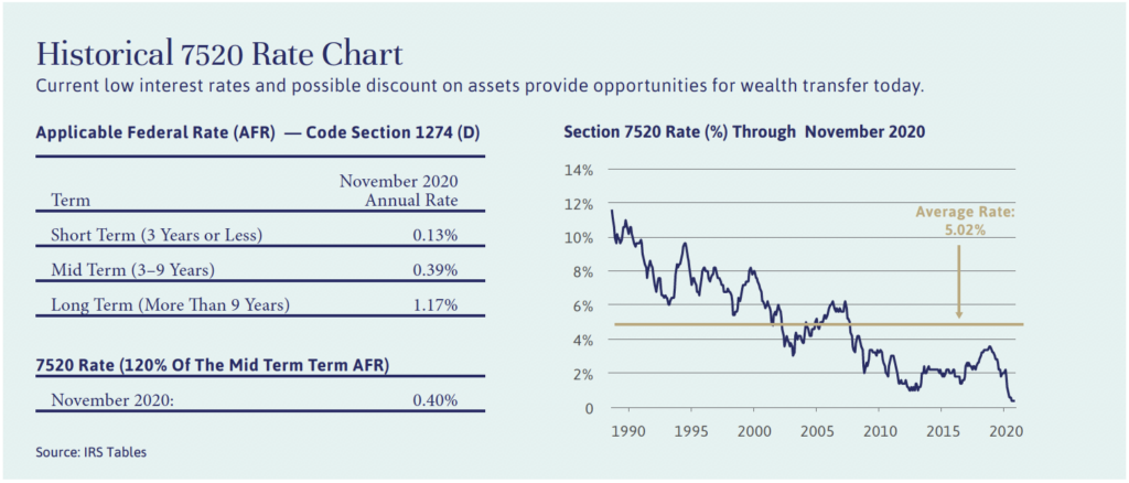 Another attractive wealth transfer mechanism in this environment is to transfer assets to one or multiple grantor retained annuity trusts, or GRATs. Funding, for example, a two-year GRAT with assets highly likely to appreciate in that period should generate an annuity over that period equal to the entire value of the funding amount plus the IRC Section 7520 rate, which is 0.4% as of November 2020. Assuming the grantor survives the term of the trust, any appreciation beyond the annuity amount passes to heirs with no gift tax or reduction in the lifetime exemption. This strategy is particularly attractive now, given the market volatility experienced this year; if the asset rebounds strongly from here, it will easily exceed the 0.4% hurdle rate. GRATs typically offer the donor the power to substitute assets, such as appreciated stock holdings, which can be an effective planning tool to lock in the appreciation as market conditions evolve and increase the tax basis for future heirs.