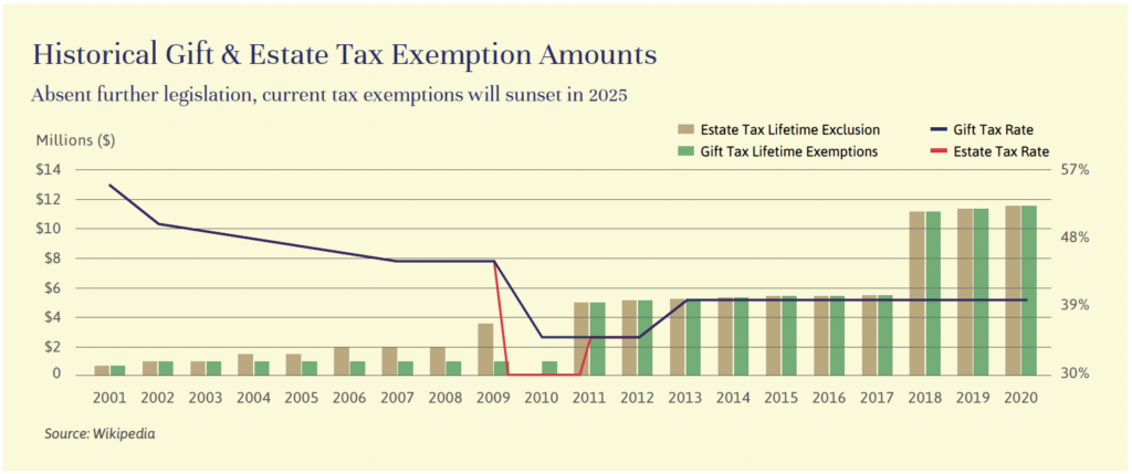 At present, the federal gift tax, estate tax and generation-skipping tax exemptions are the largest on record, as illustrated by the chart below, at $11.58 million per person or $23.16 million for a married couple. In the absence of further tax legislation, this window to shift significant assets out of an estate will sunset on December 31, 2025 and revert to $5 million per person, adjusted for inflation. As dramatic as that is, other factors should be evaluated to avoid donor’s remorse. Does the gift truly advance the family’s long-term wealth transfer objectives? Are the assets no longer required by the donor to meet lifestyle goals? These and other considerations should come first.