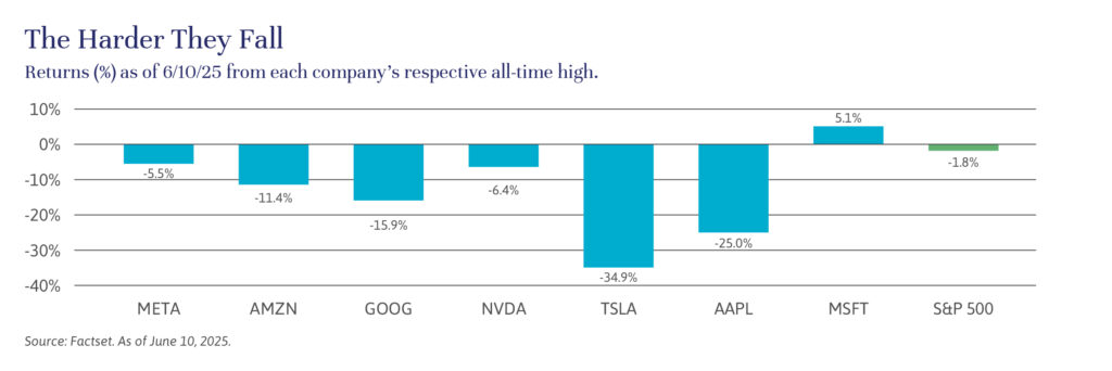 Still, AI has tested investors’ patience lately. After years of dramatic market outperformance, the share price of most members of the so-called Magnificent Seven – Amazon, Alphabet, Apple, Microsoft, Nvidia, Meta and Tesla – tumbled in recent months, as illustrated by the chart below. Though several have recovered appreciably, investors are clearly looking for a payoff.