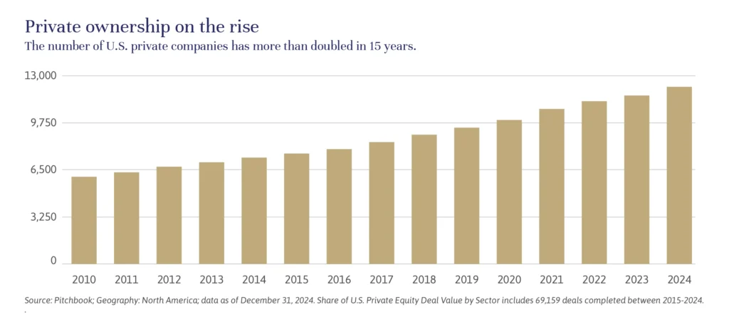 Private equity is an increasingly attractive and important asset class for most ultra high net worth investors — and for good reason. The asset class has matured over the last 30 years and now represents a large segment of U.S. corporate ownership. As illustrated here, the number of private equity-backed companies in the United States has more than doubled in the past 15 years, to over 12,000. Many successful founder-owned firms that would have gone public in the past have instead found a home within private equity funds.