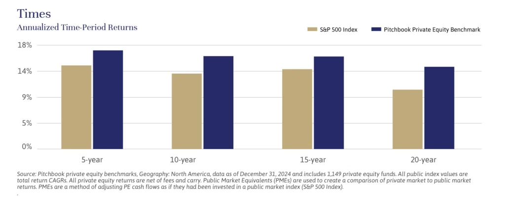 From an investor’s point of view, private equity has historically outperformed U.S. public markets over a variety of time horizons, reflecting the more hands-on, longer-term approach of private fund managers. (See the charts below.) Private equity-backed companies also have the ability to tap into the robust ecosystem of private credit, to provide flexible funding for expansion or realigning their capital structure.