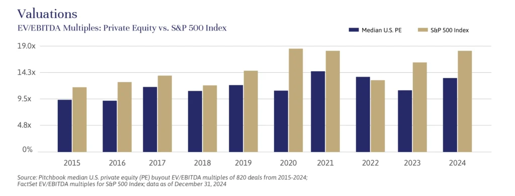 At the same time, private equity valuations remain lower than those in the public markets, as also illustrated in the chart “Valuations”, below. While the S&P 500 is dominated by the largest companies and is, as of this writing, close to all-time-high valuations, private equity-owned companies have far more reasonable valuations.