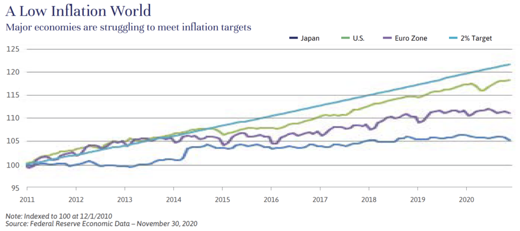Talk of another stimulus package in the United States – this time to the tune of $1.9 trillion, although that is likely to be watered down by the nearly balanced Senate – has given rise to more talk of inflation. Again, recent evidence suggests that the reverse will hold true and inflation will remain suppressed. But this dynamic could change if there is a reversal in one or more of the global deflationary forces, including population growth, innovation, high debt loads and globalization, or if the Fed simply throws all caution to the wind in its determination to increase consumer inflation by bypassing the banking system and sending newly created dollars directly to consumers.